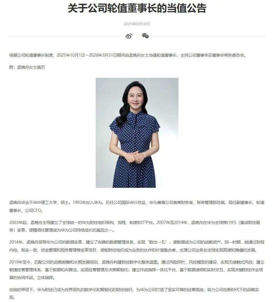 9月30日,华为的官方网站显示,据该公司董事长轮换系统称,孟·旺州女士将从2025年10月1日至2026年3月31日担任轮换主席,并领导公司董事董事会和董事会常务委员会。 (以下文本源自华为的官方网站)Meng Wanzhou毕业于华盛科学技术大学的硕士学位。他于1993年加入华为。他曾担任该公司的国际会计总监,华为香港公司的首席财务官和会计管理部长。他目前是副主席,轮换董事长和公司CFO。自2003年以来,Meng Wanzhou一直在领导建立全球,以促进华为金融,流程,IT系统和平台的组织。从2007年到2014华为的IDE对华为持续增长的基因之一进行了很好的管理。 2014年,孟万州(Meng Wanzhou)领导了华为数据的转换,并建立了一个完整的数据管理系统,以实现“计数漏洞”,并生成了战略公司所有权的数据。同时,他使金融组织能够通过改革项目(例如内部控制金融报告,联合帐户,资金和税收管理,并支持该公司的业务实现全球快速,稳定的开发项目)来成为业务伙伴和价值集成商。从2019年到现在,Meng Wanzhou已根据Strategic Strategic G和长期公司发展计划制定了一项一般金融数字化计划。通过构建风险探针和控制控制模型,可以实现接触控制;建立了敏捷业务管理系统,并根据数据和AI算法实现业务管理和决策;一个建立了n个集成的战斗命令平台,并根据数据透明度和实时联系来实现协调的战斗和三维命令。在他的领导下,华为财务已成为全球领先的数字和智能金融组织,为华为创造了一个稳定且可靠的商业基础,并帮助公司实现了其对新时代的方法。来源|华为经济的官方网站中的太阳经济新闻
